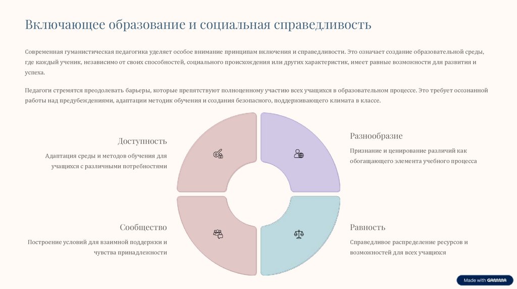 Включающее образование и социальная справедливостьСовременная гуманистическая педагогика уделяет особое внимание принципам включения и справедливости. Это означает создание образовательной среды,