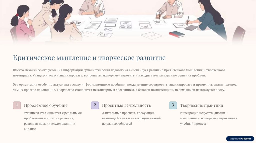 Критическое мышление и творческое развитиеВместо механического усвоения информации гуманистическая педагогика акцентирует развитие критического мышления и творческого