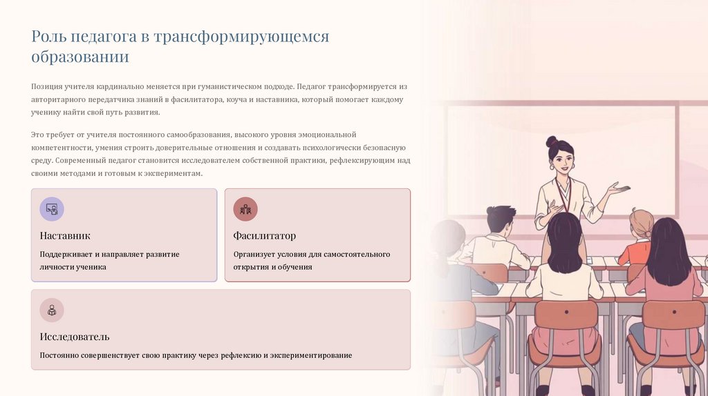 становится не авторитарной фигурой, а партнёром в образовательном процессе, создающим условия для личностного роста.