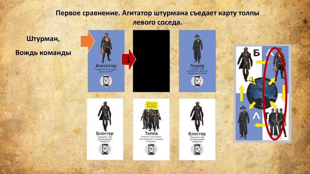 Первое сравнение. Агитатор штурмана съедает карту толпылевого соседа.