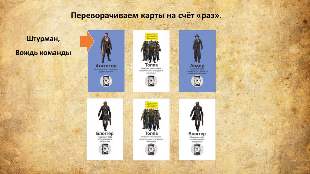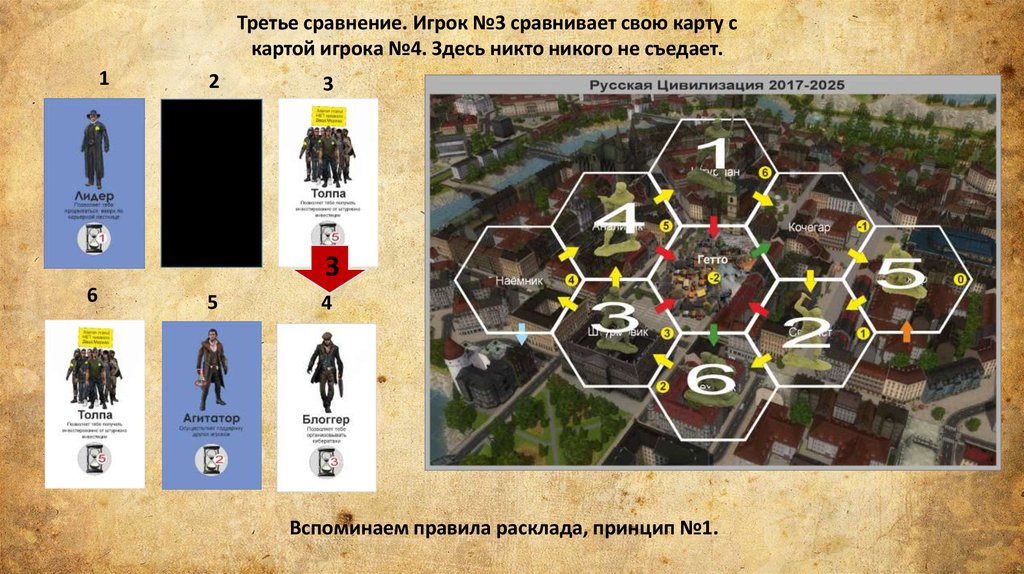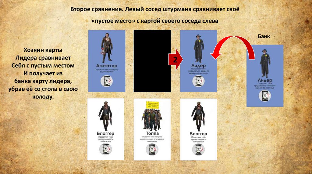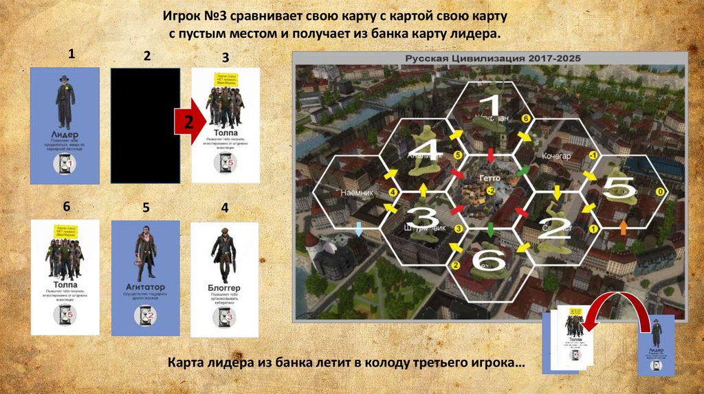 Игрок №3 сравнивает свою карту с картой свою картус пустым местом и получает из банка карту лидера.