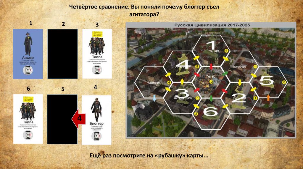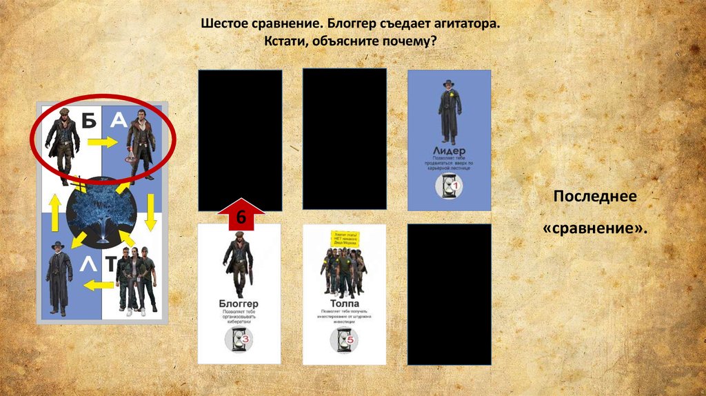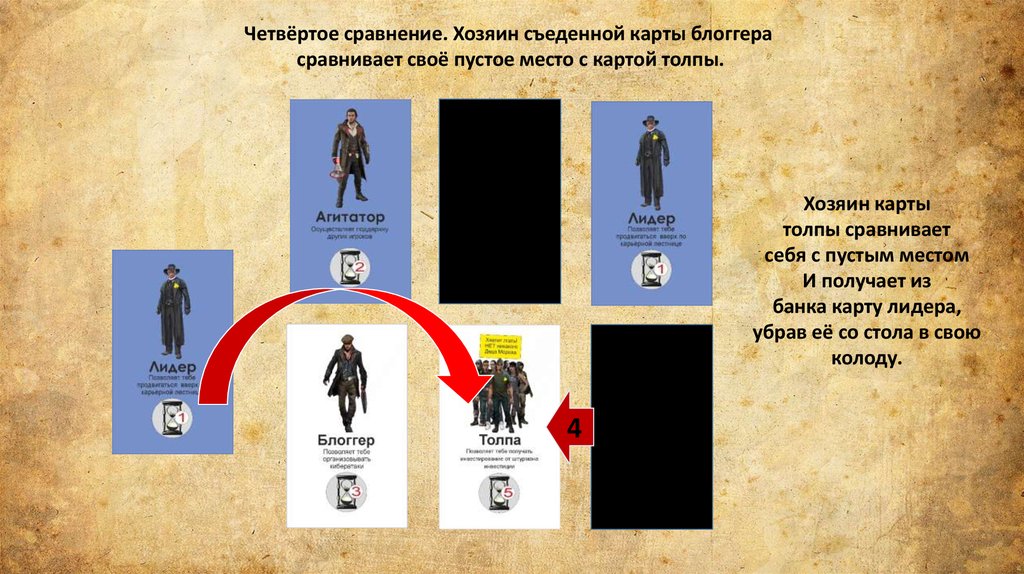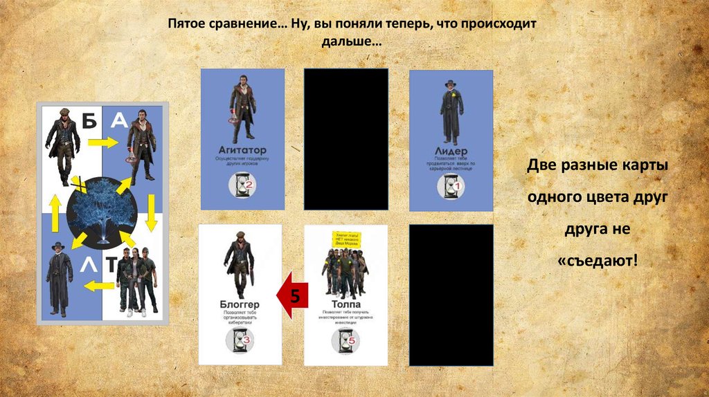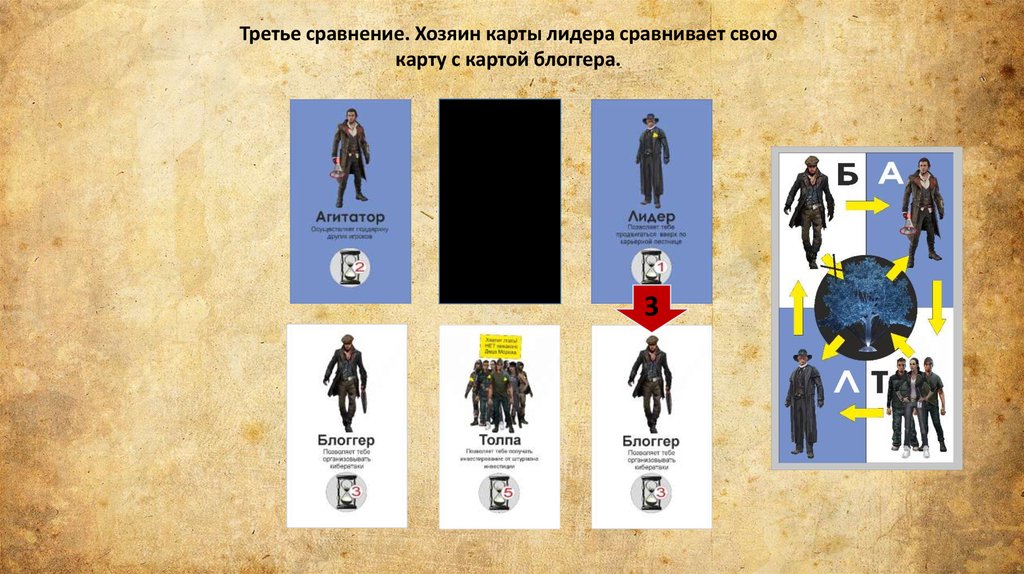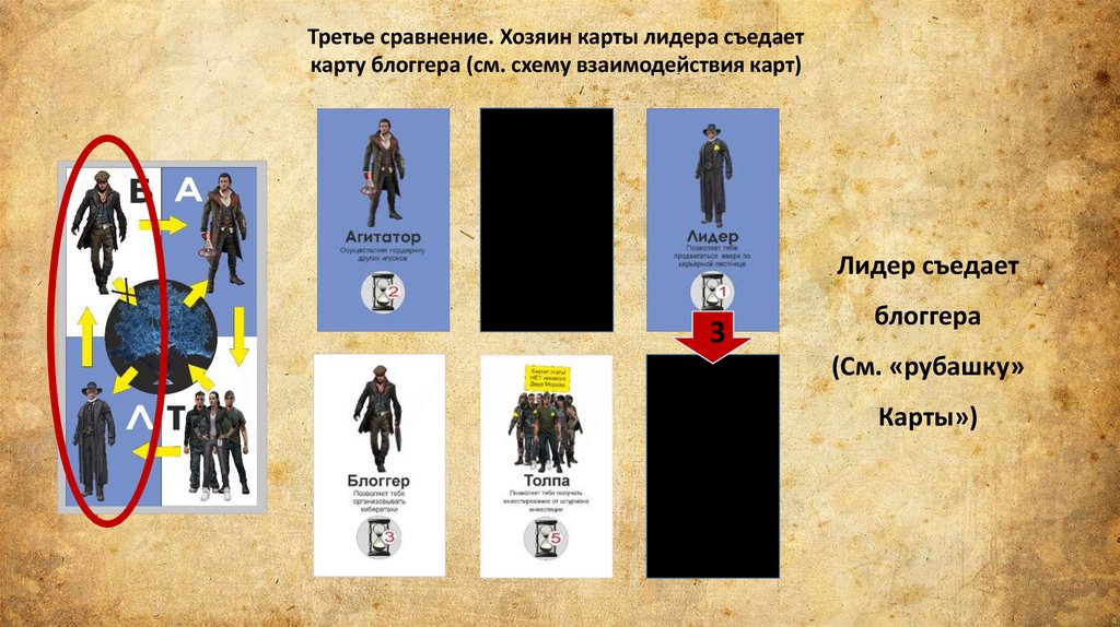 Третье сравнение. Хозяин карты лидера съедаеткарту блоггера (см. схему взаимодействия карт)