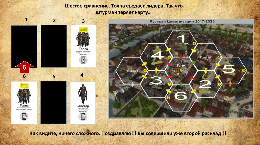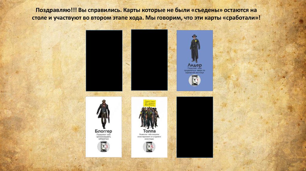 Поздравляю!!! Вы справились. Карты которые не были «съедены» остаются настоле и участвуют во втором этапе хода. Мы говорим, что эти карты «сработали»!