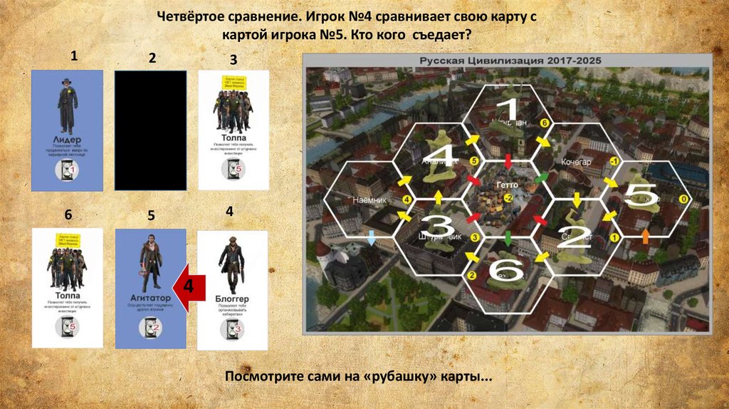 Четвёртое сравнение. Игрок №4 сравнивает свою карту скартой игрока №5. Кто кого съедает?