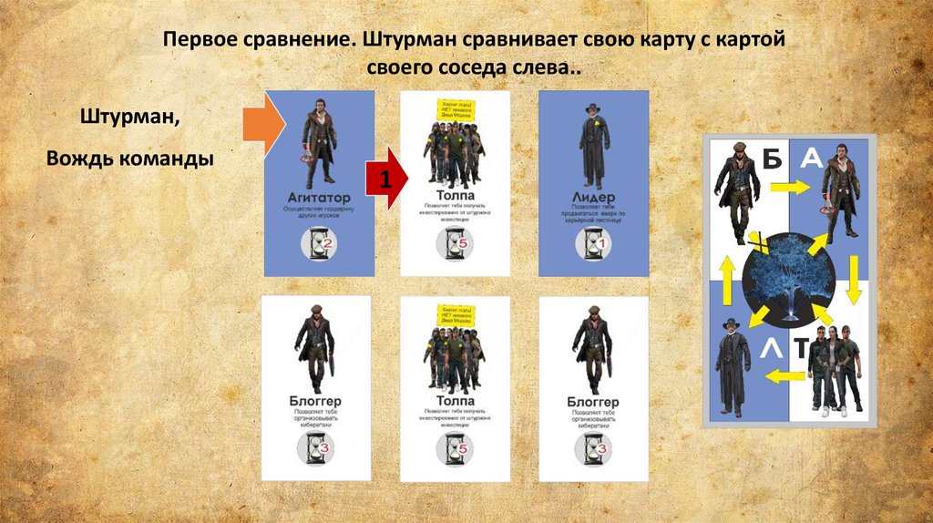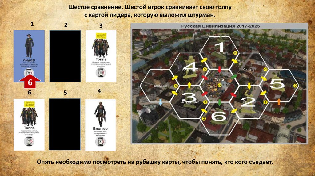 Шестое сравнение. Шестой игрок сравнивает свою толпус картой лидера, которую выложил штурман.