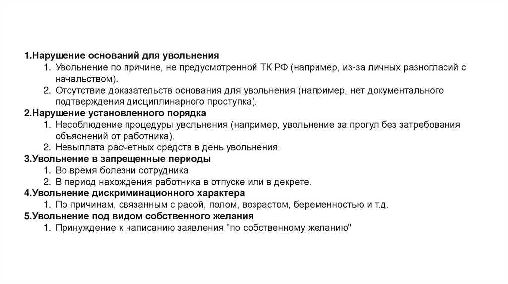 1.Нарушение оснований для увольнения1. Увольнение по причине, не предусмотренной ТК РФ (например, из-за личных разногласий с