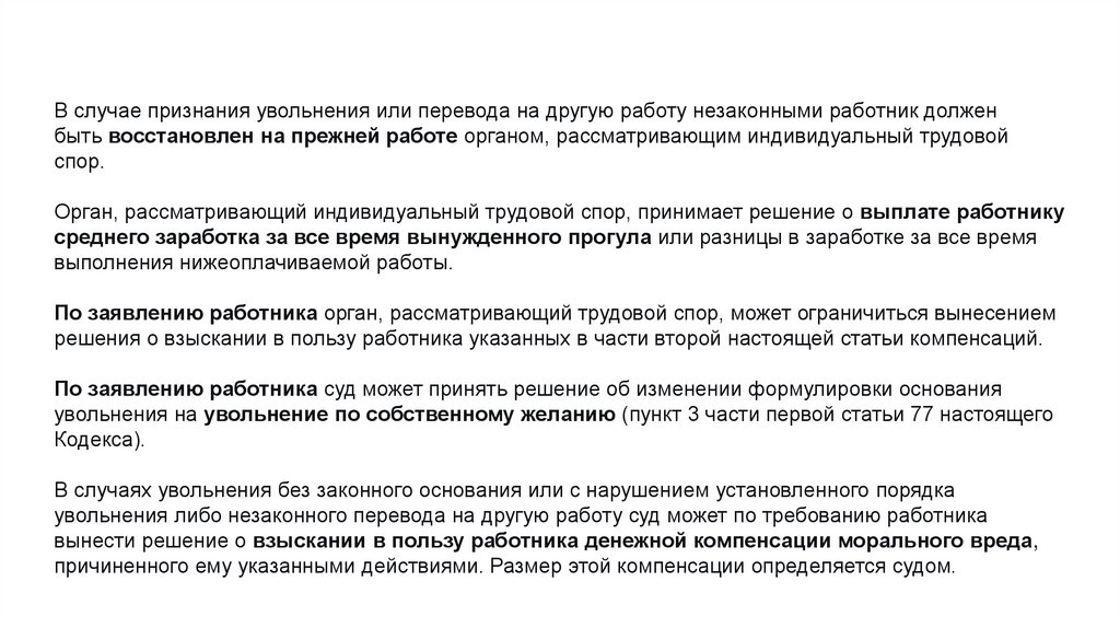 В случае признания увольнения или перевода на другую работу незаконными работник долженбыть восстановлен на прежней работе органом, рассматривающим индивидуальный трудовой