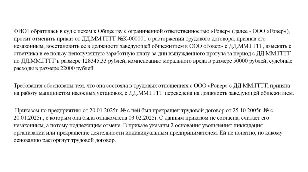 ФИО1 обратилась в суд с иском к Обществу с ограниченной ответственностью «Ровер» (далее - ООО «Ровер»),просит отменить приказ от ДД.ММ.ГГГГ №К-000001 о расторжении трудового договора, признав его