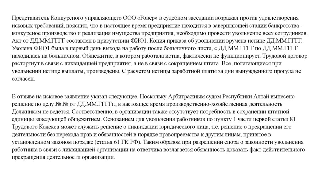 Представитель Конкурсного управляющего ООО «Ровер» в судебном заседании возражал против удовлетворенияисковых требований, пояснил, что в настоящее время предприятие находится в завершающей стадии банкротства конкурсное производство и реализация имущества предприятия, необходимо провести увольнение всех сотрудников.