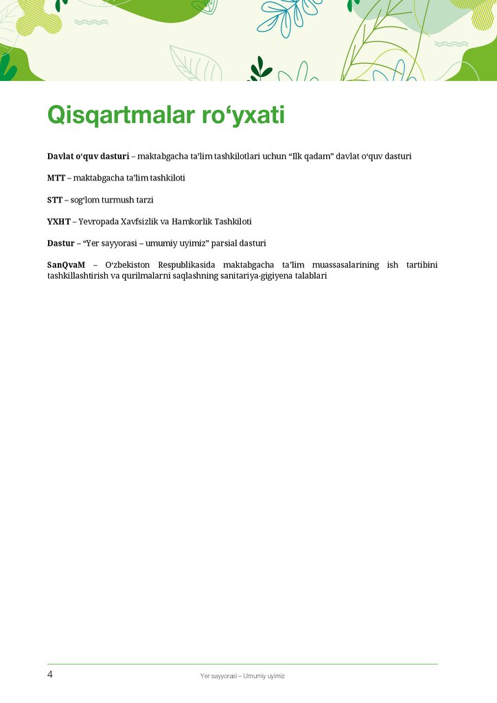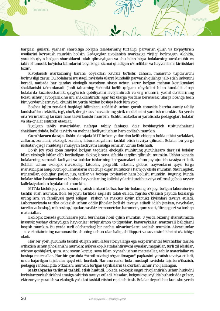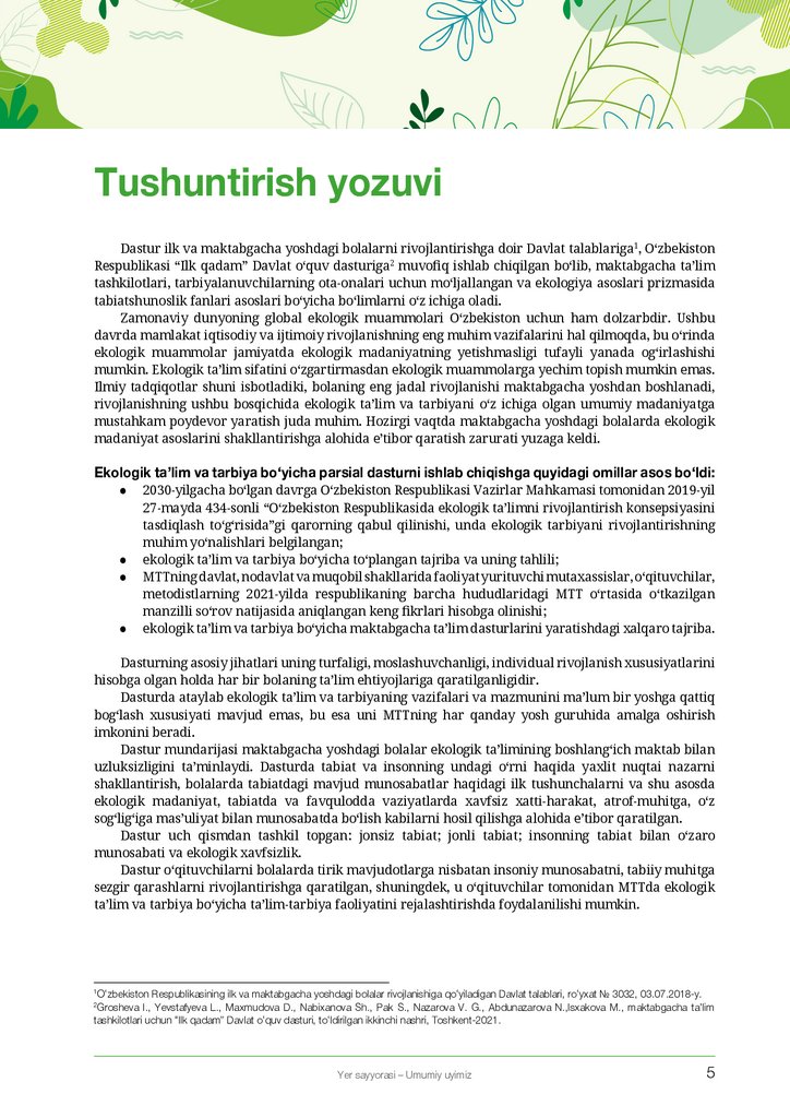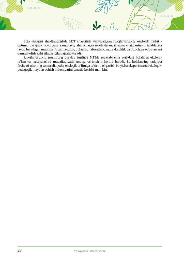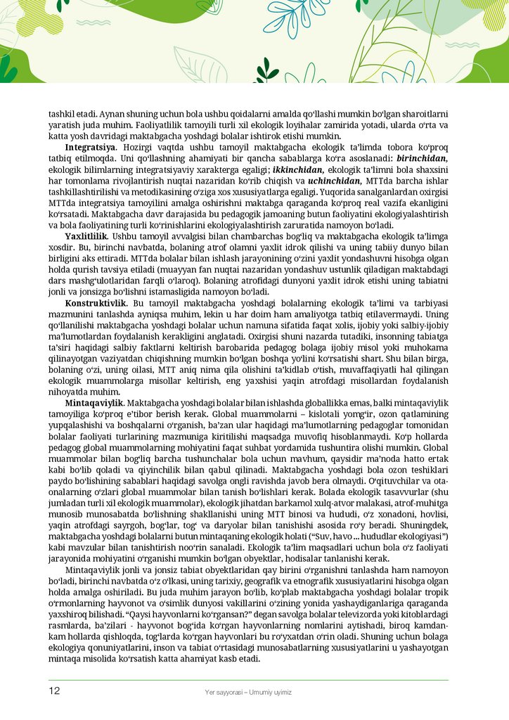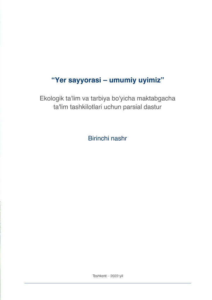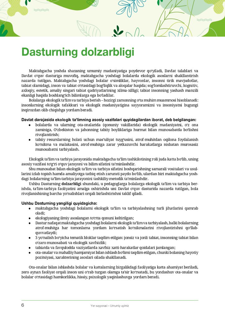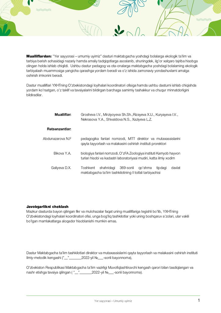 Mualliflardan: “Yer sayyorasi – umumiy uyimiz” dasturi maktabgacha yoshdagi bolalarga ekologik ta’lim vatarbiya berish sohasidagi nazariy hamda amaliy tadqiqotlarga asoslanib, shuningdek, ilg‘or xalqaro tajriba hisobga