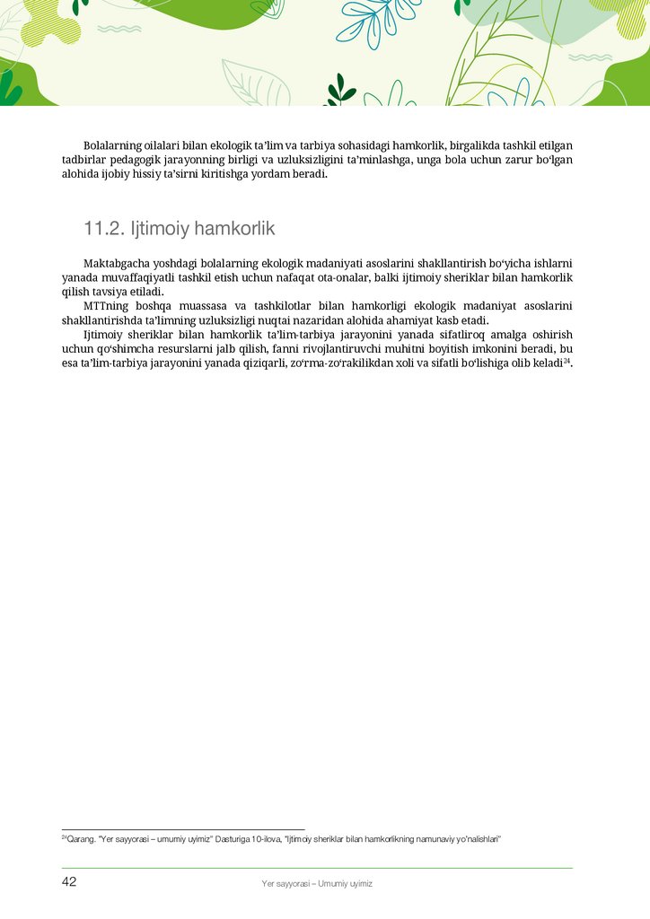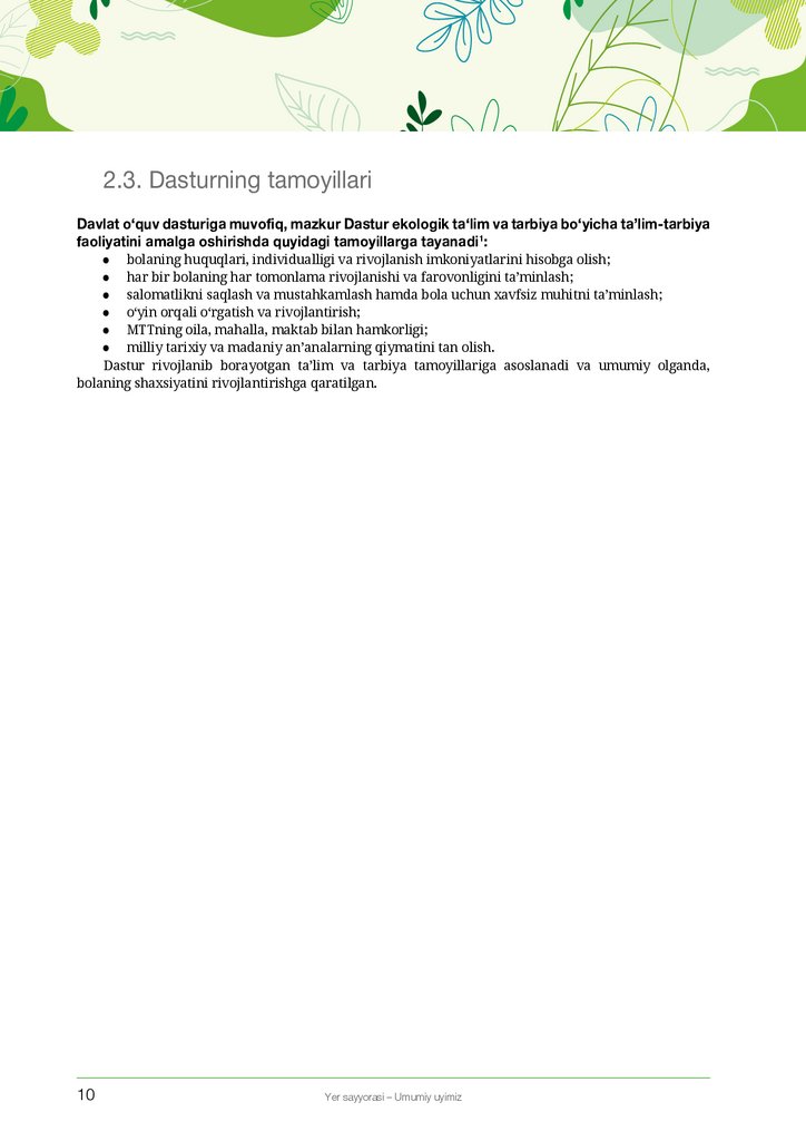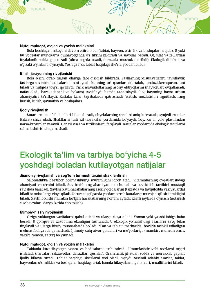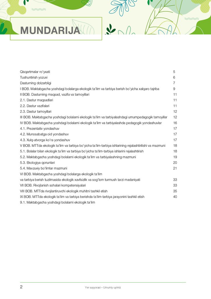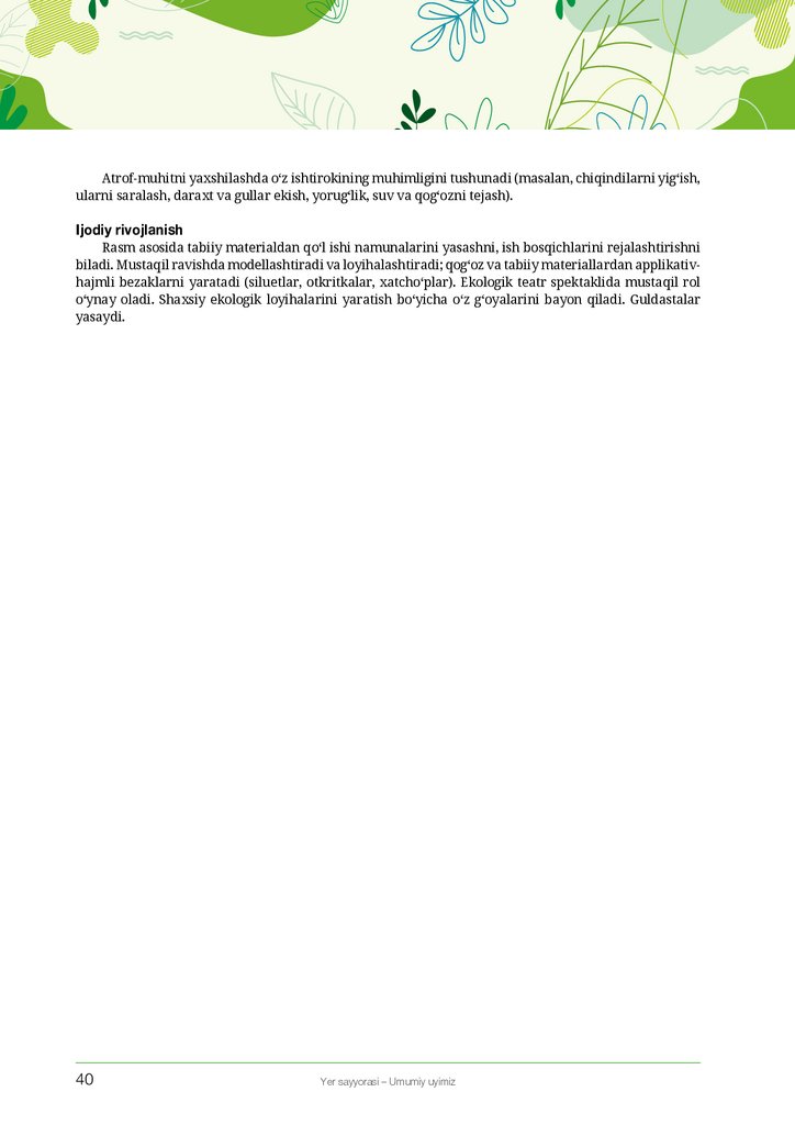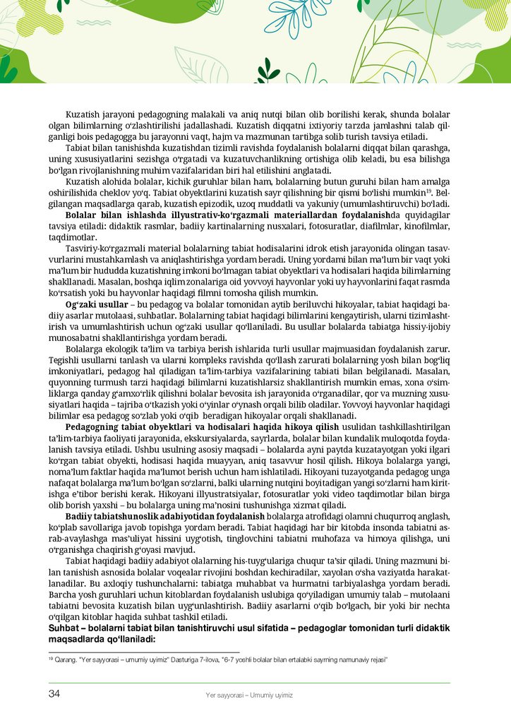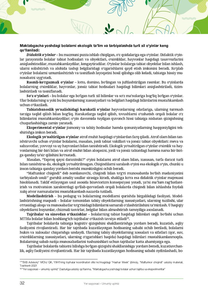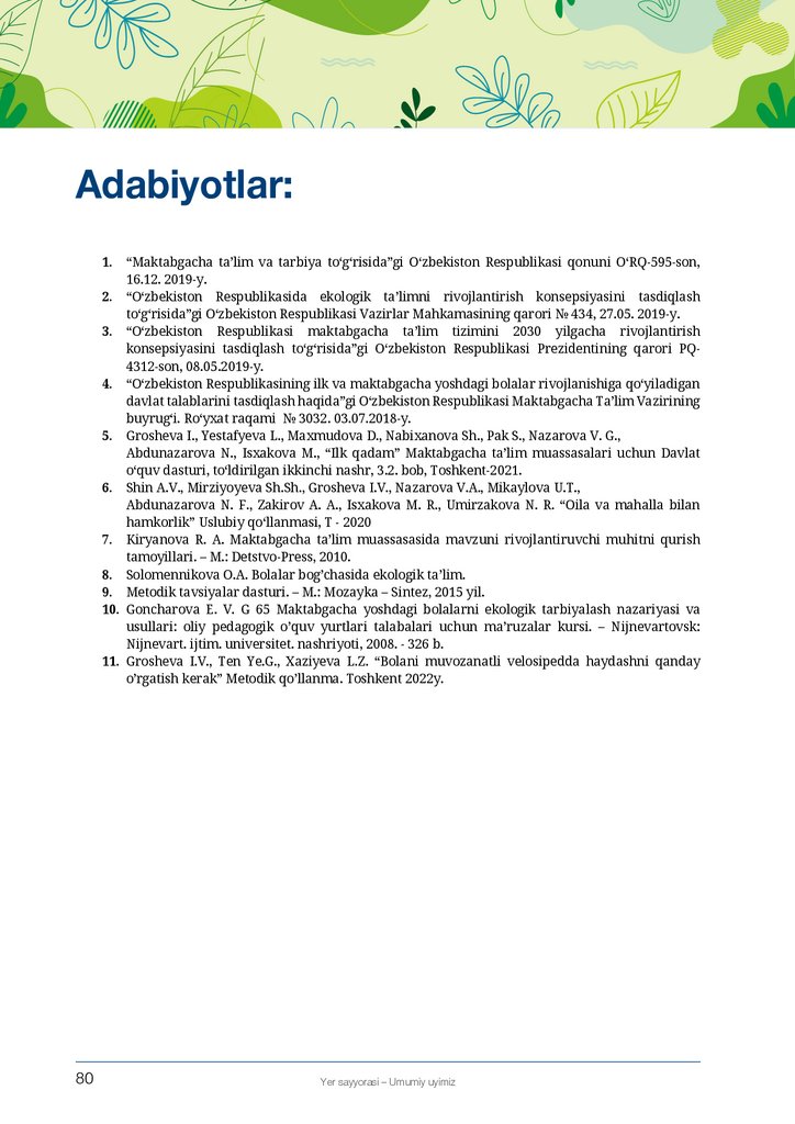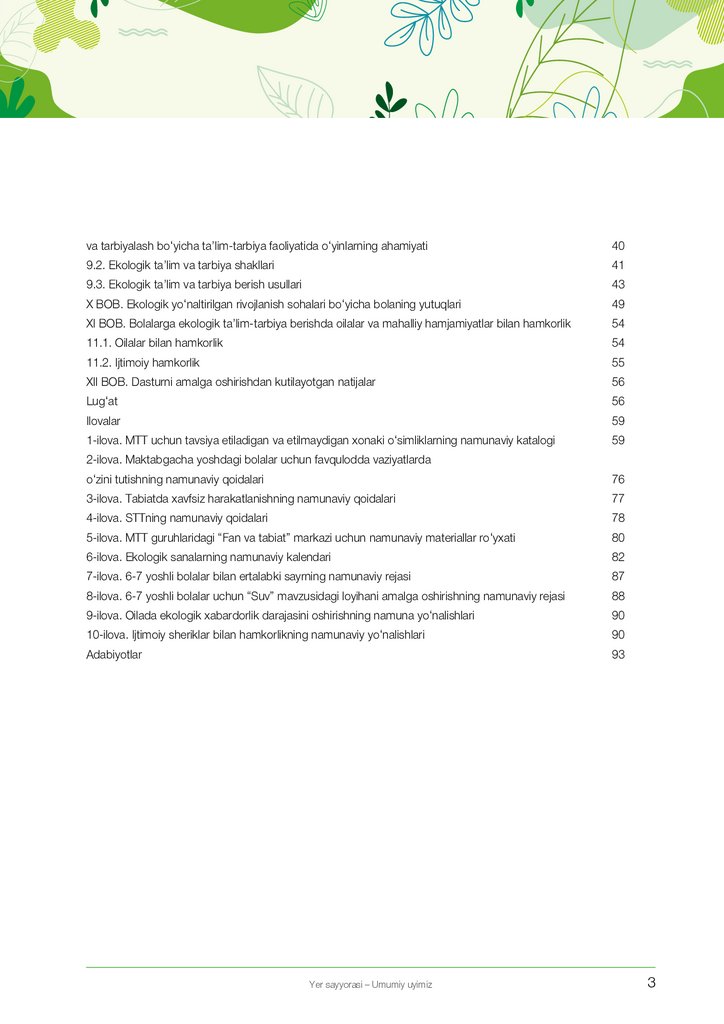 Mualliflardan: “Yer sayyorasi – umumiy uyimiz” dasturi maktabgacha yoshdagi bolalarga ekologik ta’lim vatarbiya berish sohasidagi nazariy hamda amaliy tadqiqotlarga asoslanib, shuningdek, ilg‘or xalqaro tajriba hisobga
