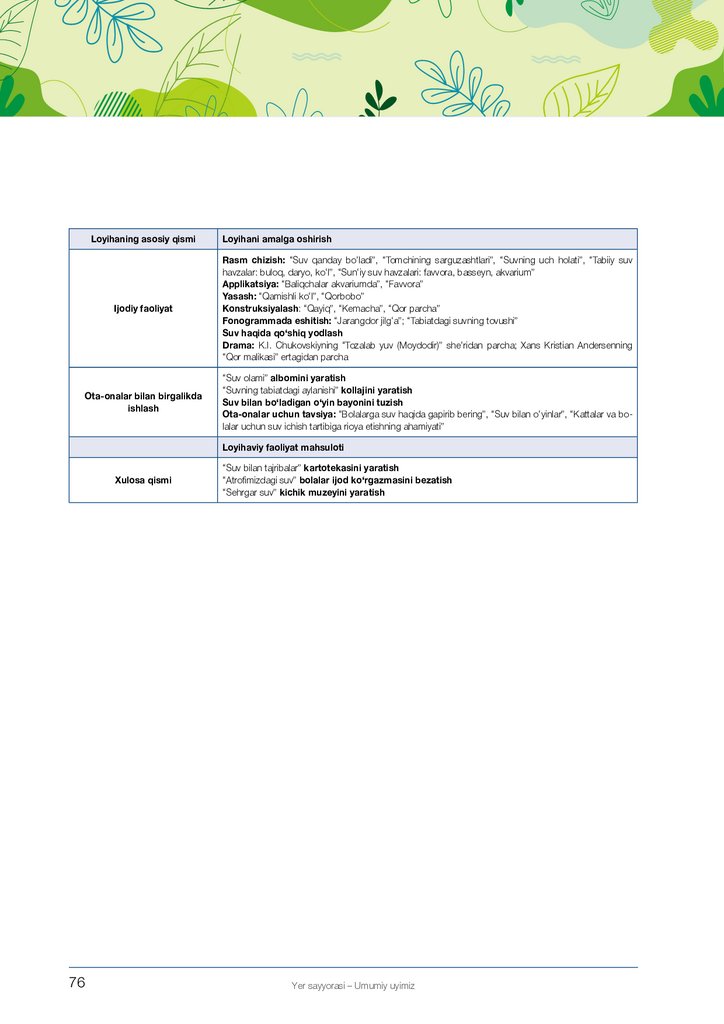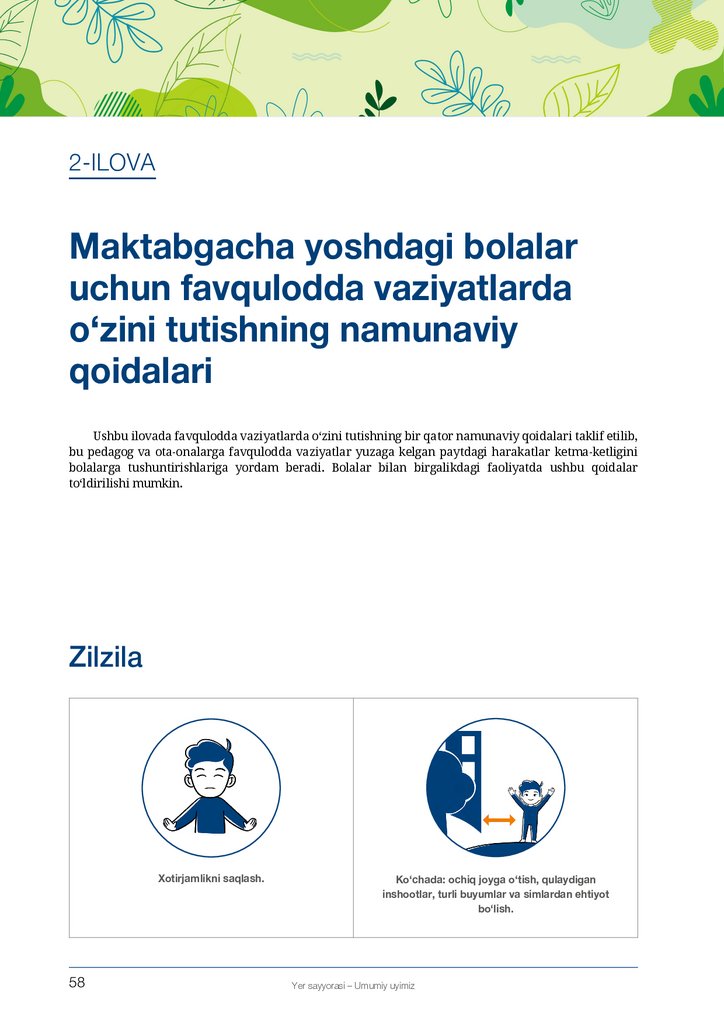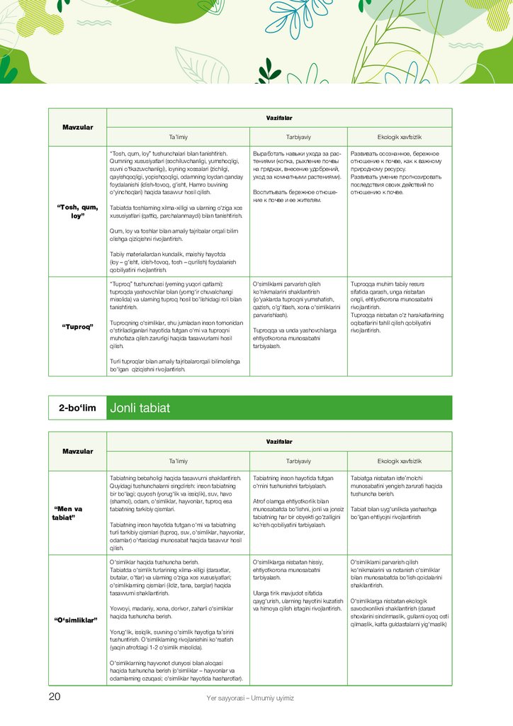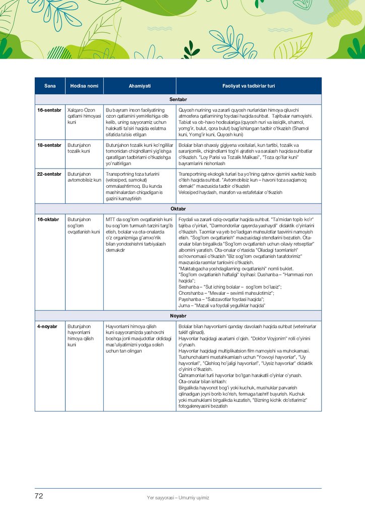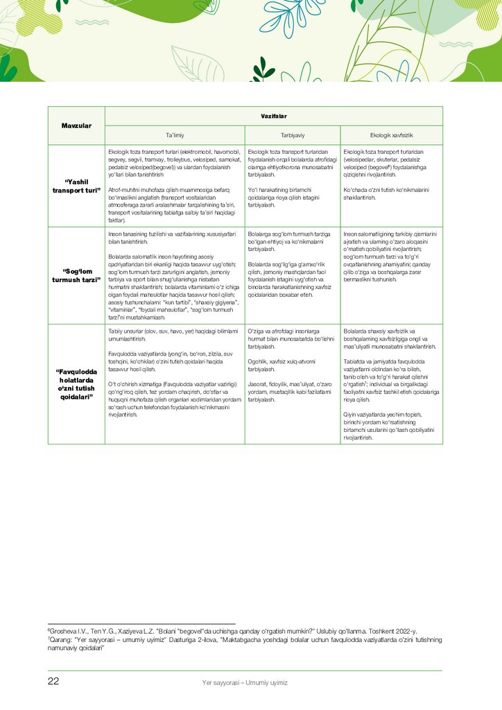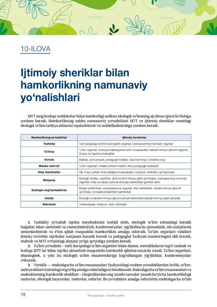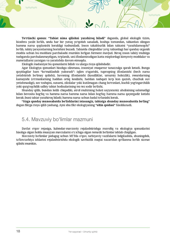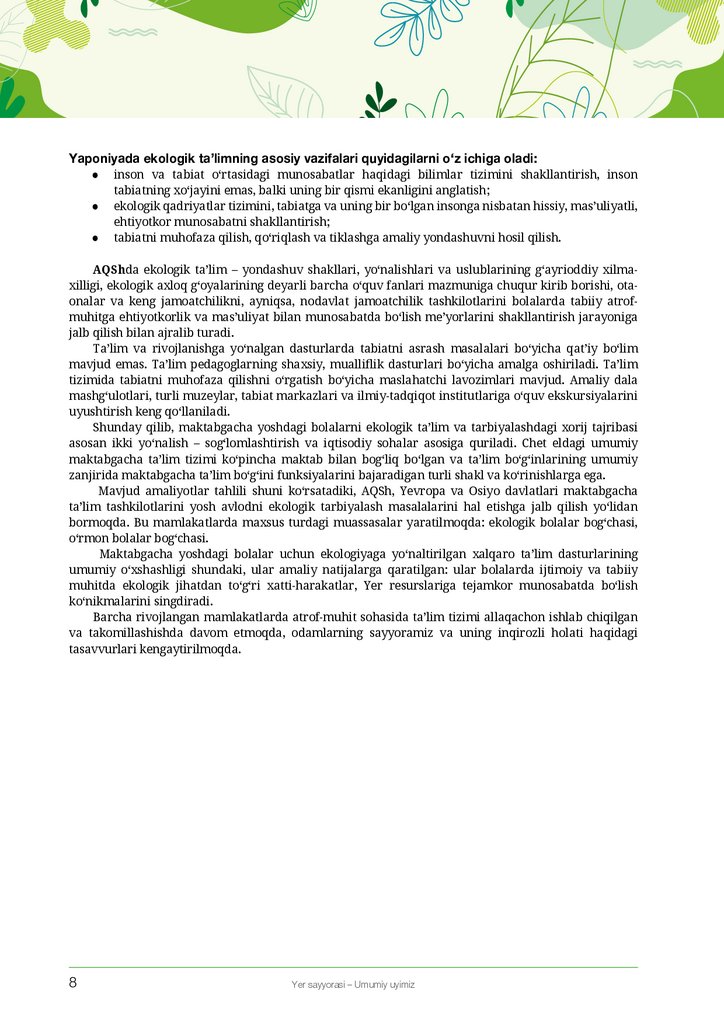 Mualliflardan: “Yer sayyorasi – umumiy uyimiz” dasturi maktabgacha yoshdagi bolalarga ekologik ta’lim vatarbiya berish sohasidagi nazariy hamda amaliy tadqiqotlarga asoslanib, shuningdek, ilg‘or xalqaro tajriba hisobga