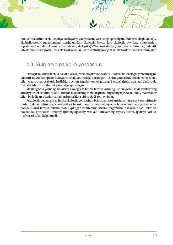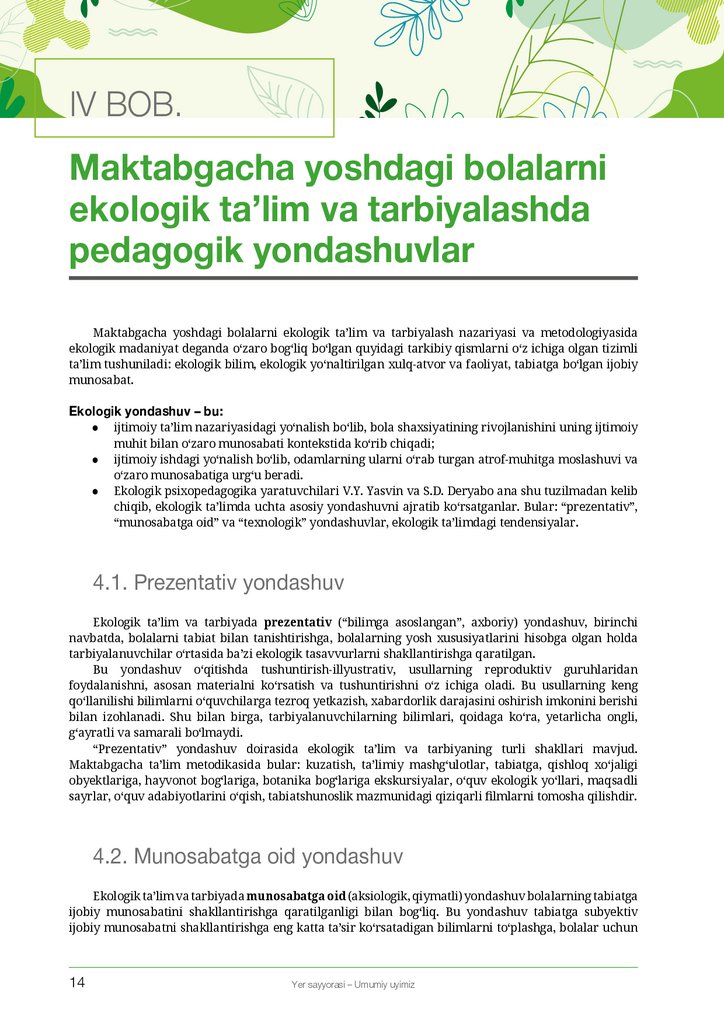 IV BOB. Maktabgacha yoshdagi bolalarni ekologik ta’lim va tarbiyalashda pedagogik yondashuvlar