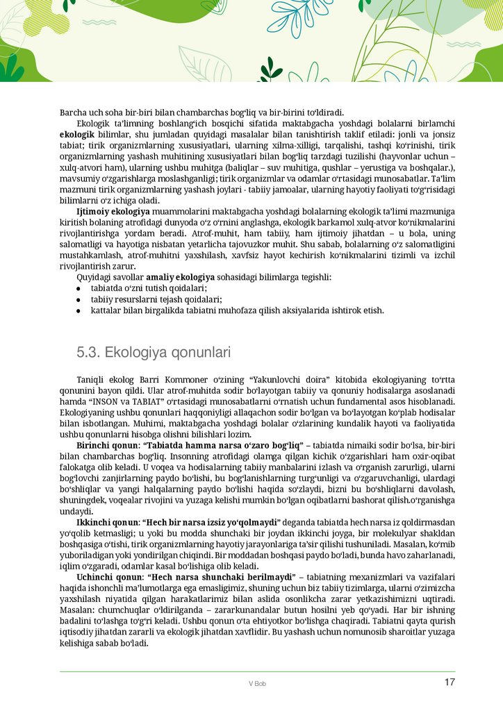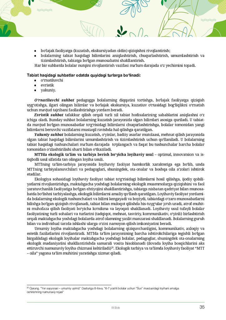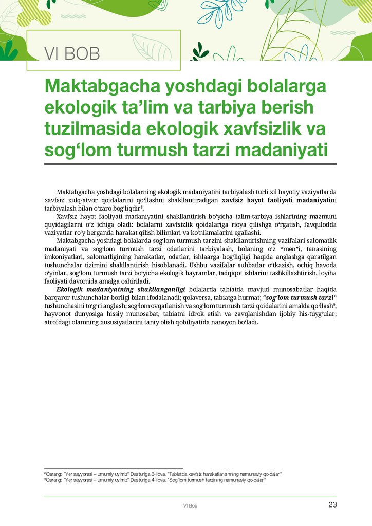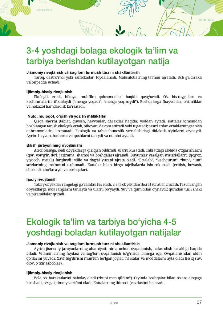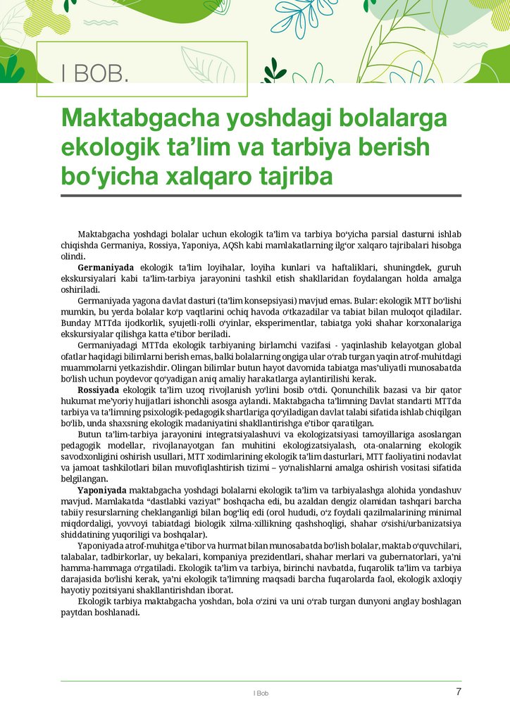 I BOB. Maktabgacha yoshdagi bolalarga ekologik ta’lim va tarbiya berish bo‘yicha xalqaro tajriba