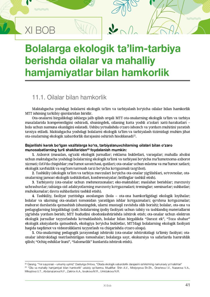 XI BOB. Bolalarga ekologik ta’lim-tarbiya berishda oilalar va mahalliy hamjamiyatlar bilan hamkorlik