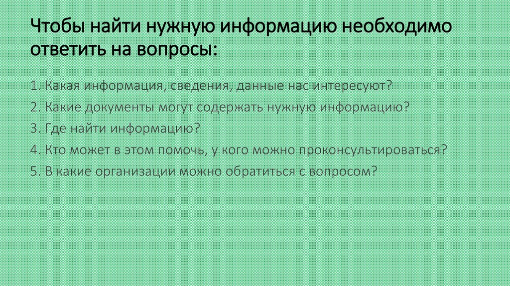 Чтобы найти нужную информацию необходимоответить на вопросы: