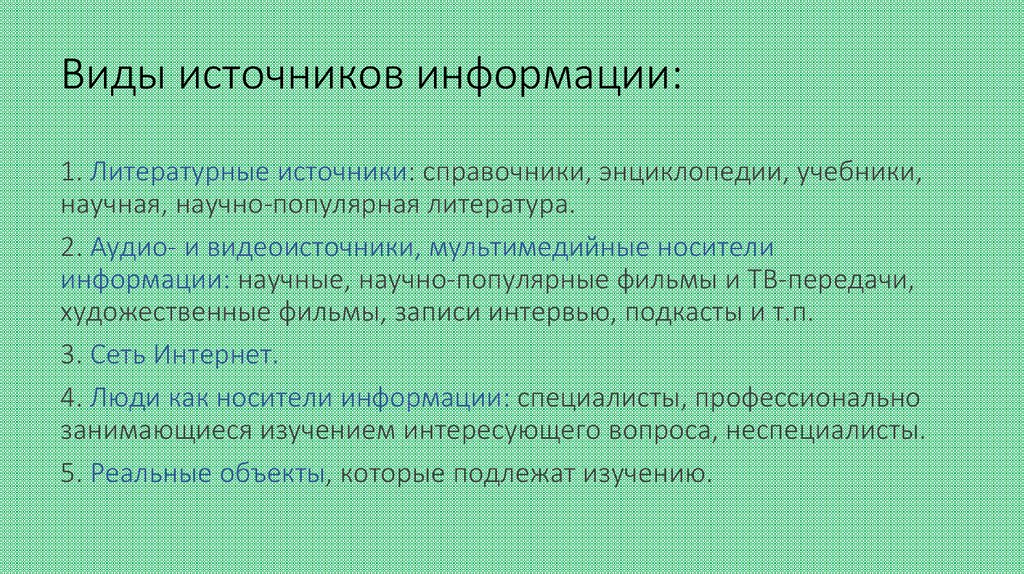 Виды источников информации:1. Литературные источники: справочники, энциклопедии, учебники,