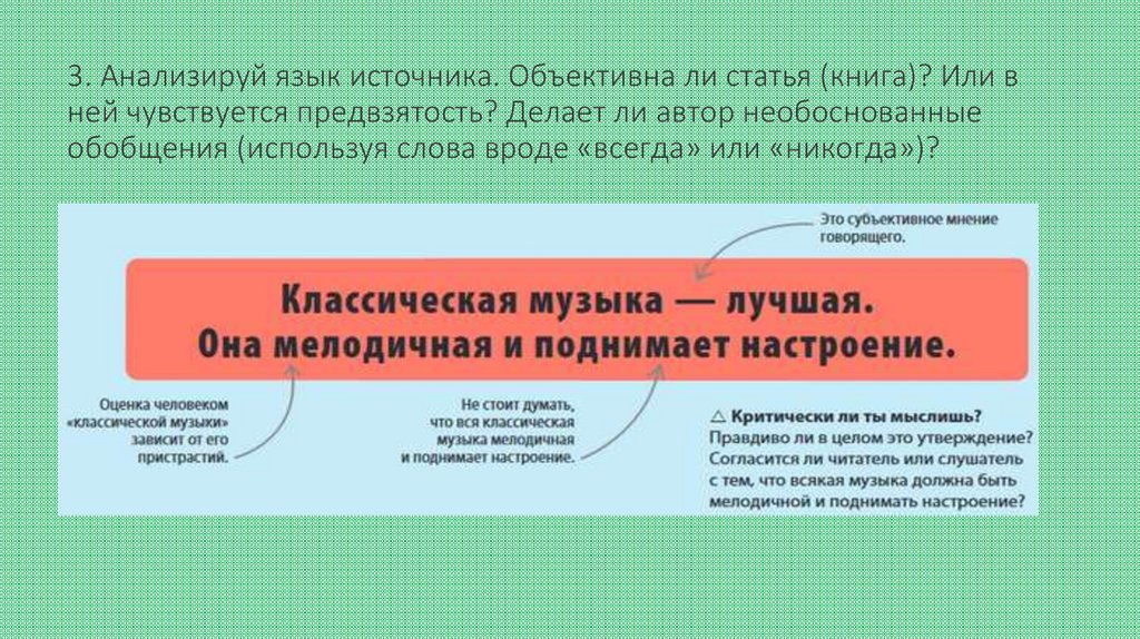 3. Анализируй язык источника. Объективна ли статья (книга)? Или вней чувствуется предвзятость? Делает ли автор необоснованные