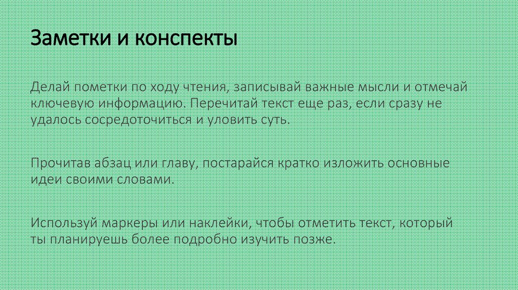 Заметки и конспектыДелай пометки по ходу чтения, записывай важные мысли и отмечай