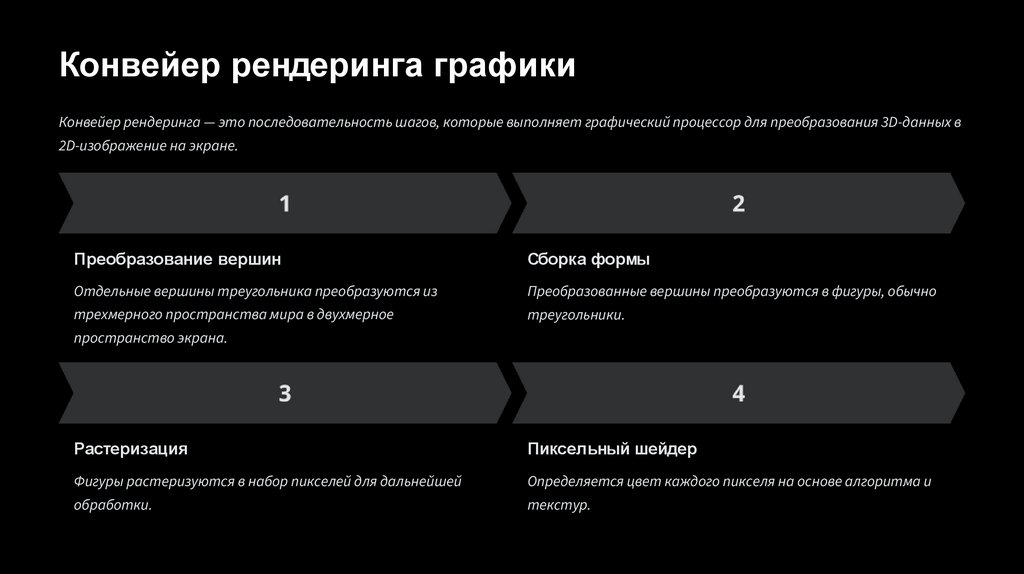 Конвейер рендеринга графикиКонвейер рендеринга — это последовательность шагов, которые выполняет графический процессор для преобразования 3D-данных в