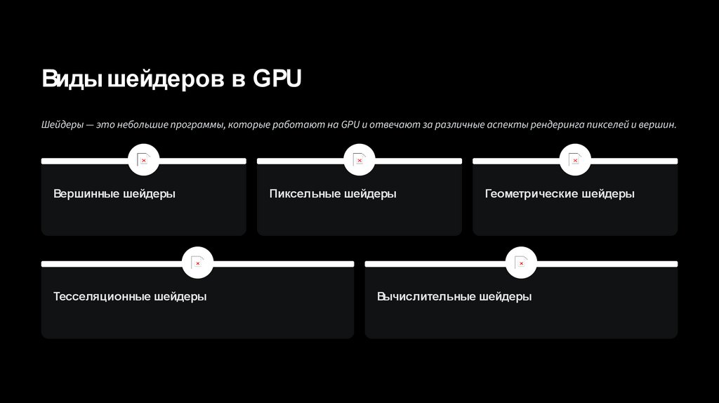 Виды шейдеров в GPUШейдеры — это небольшие программы, которые работают на GPU и отвечают за различные аспекты рендеринга пикселей и вершин.