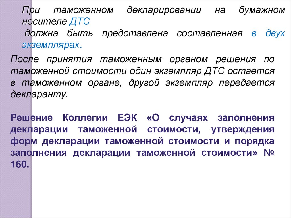При таможенном декларировании на бумажномносителе ДТС
