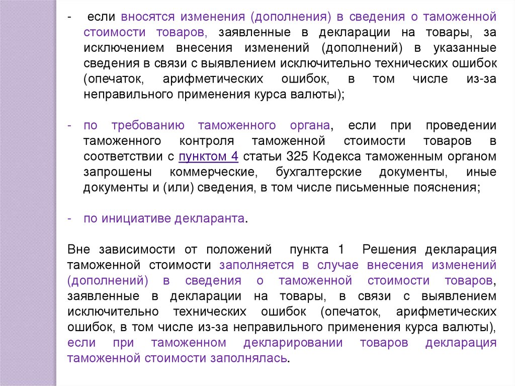 таможенной стоимости заполняется в случае внесения изменений
