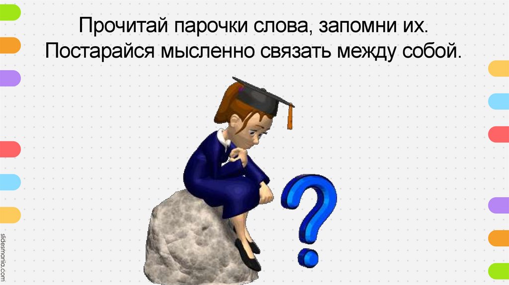 Прочитай парочки слова, запомни их.Постарайся мысленно связать между собой.