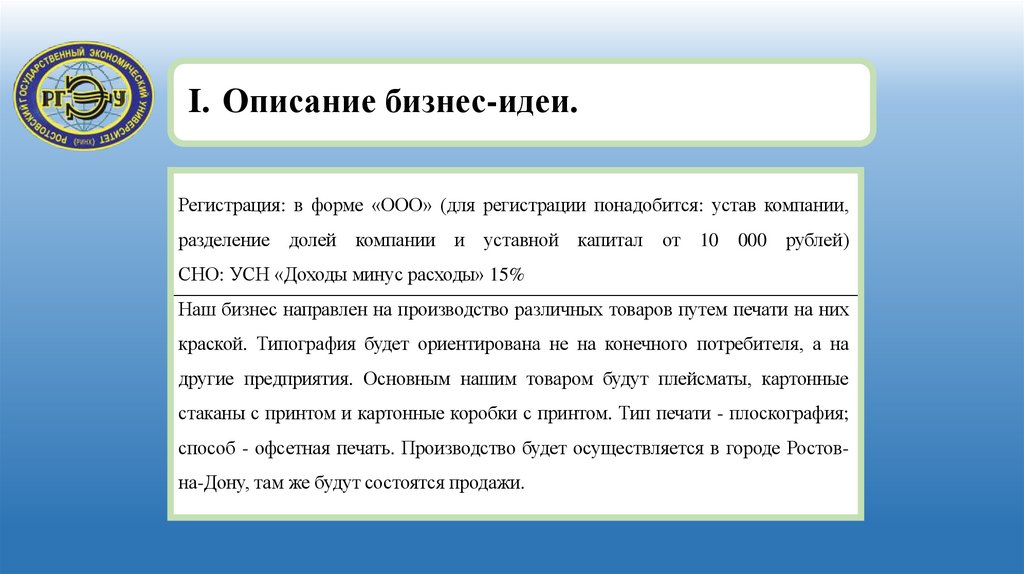 I. Описание бизнес-идеи.Регистрация: в форме «ООО» (для регистрации понадобится: устав компании,