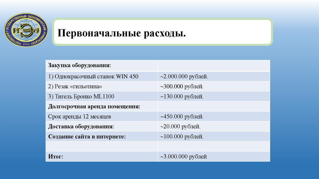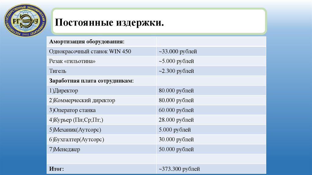 расходов, мы учли амортизацию всех станков и ЗП сотрудников. Таким образом,