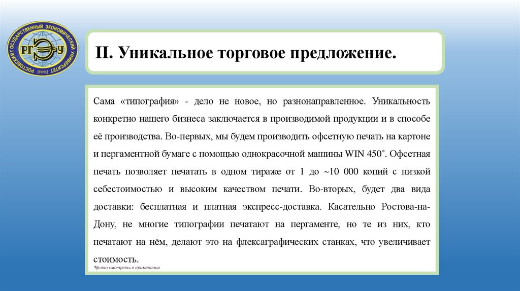 II. Уникальное торговое предложение.Сама «типография» - дело не новое, но разнонаправленное. Уникальность