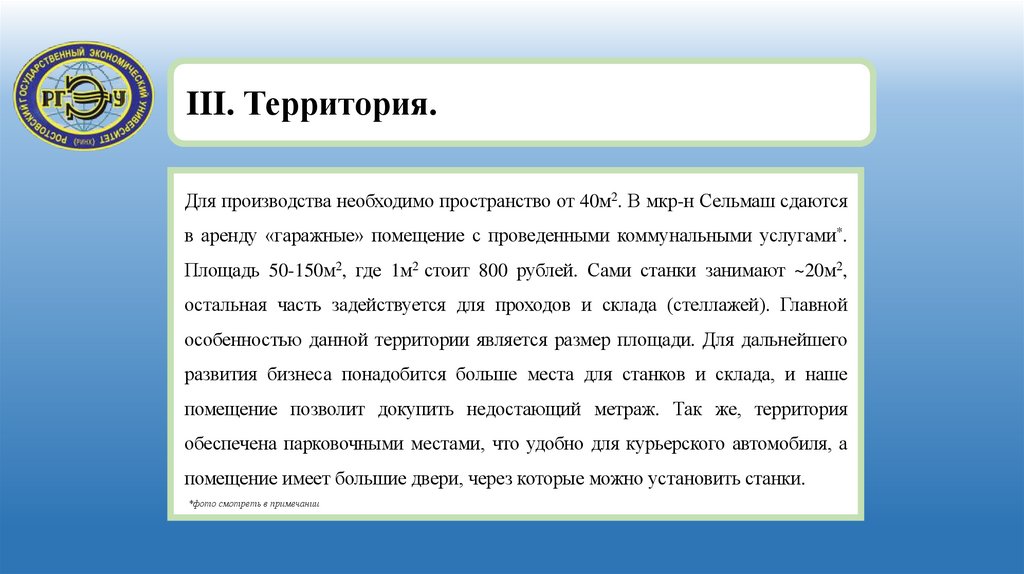 III. Территория.Для производства необходимо пространство от 40м2. В мкр-н Сельмаш сдаются