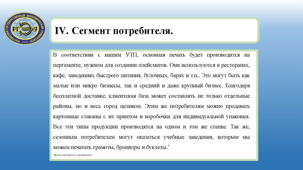 IV. Сегмент потребителя.В соответствии с нашим УТП, основная печать будет производится на