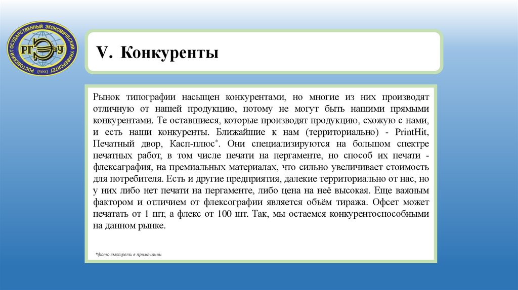 V. КонкурентыРынок типографии насыщен конкурентами, но многие из них производят