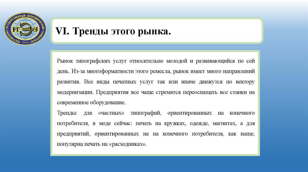 VI. Тренды этого рынка.Рынок типографских услуг относительно молодой и развивающийся по сей