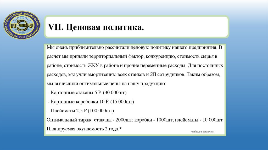 VII. Ценовая политика.Мы очень приблизительно рассчитали ценовую политику нашего предприятия. В