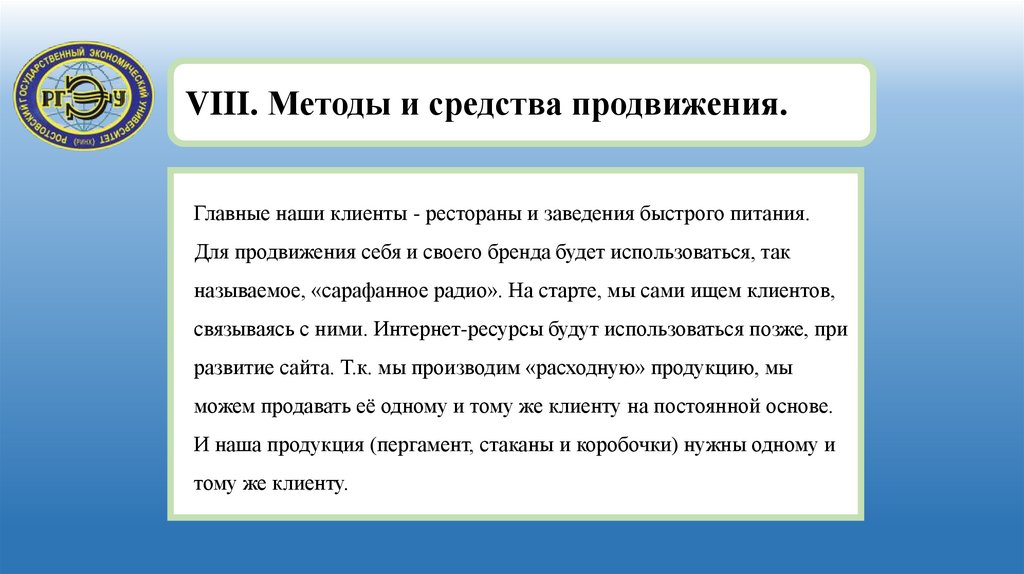 VIII. Методы и средства продвижения.Главные наши клиенты - рестораны и заведения быстрого питания.