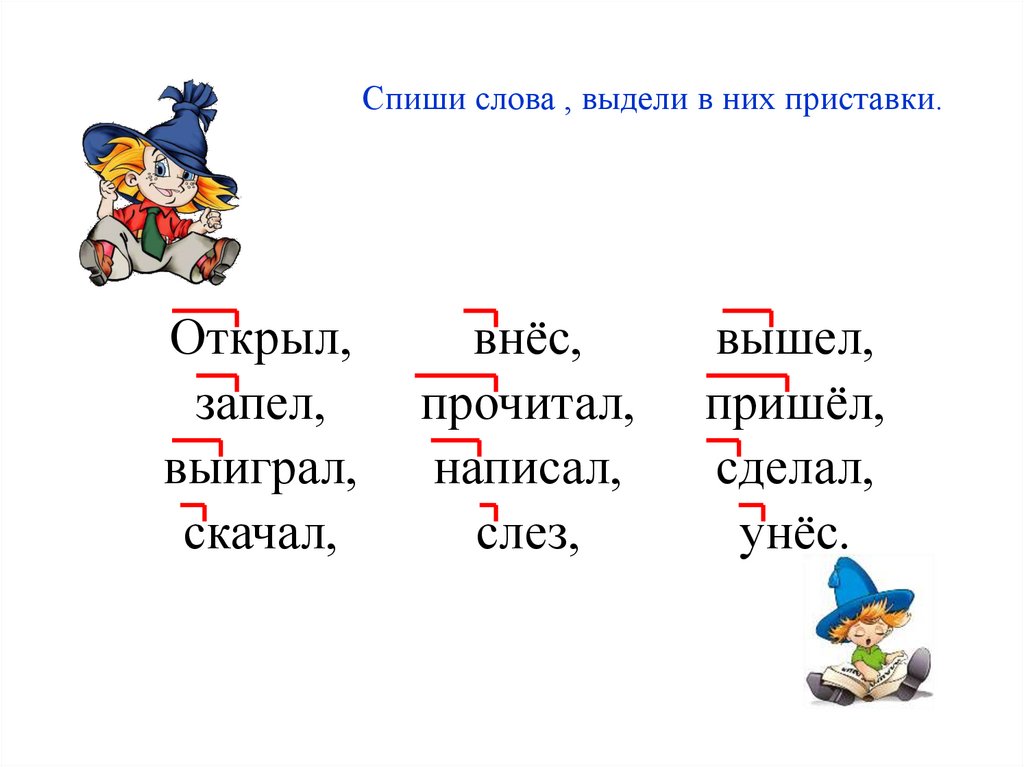 до-, пере-, в-, с-, от-, про-, у-, вы-, по-, из-.