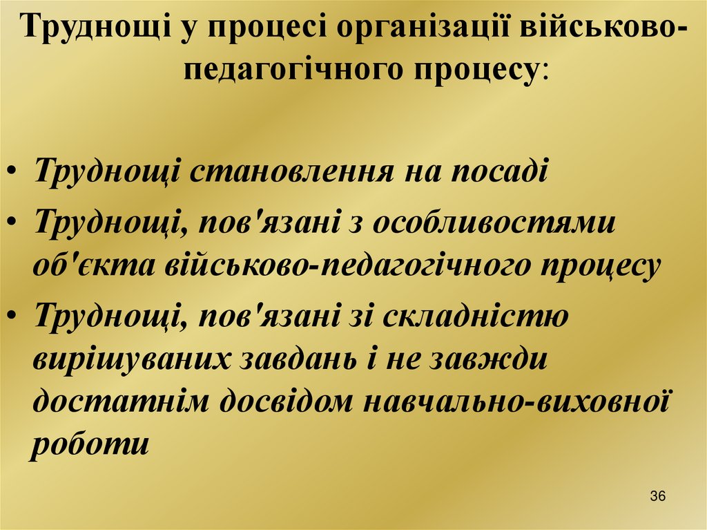 Труднощі у процесі організації військовопедагогічного процесу:• Труднощі становлення на посаді