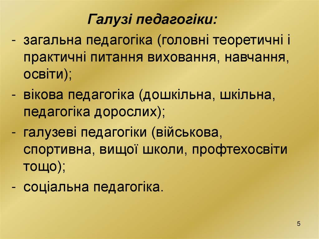 Галузі педагогіки:- загальна педагогіка (головні теоретичні і