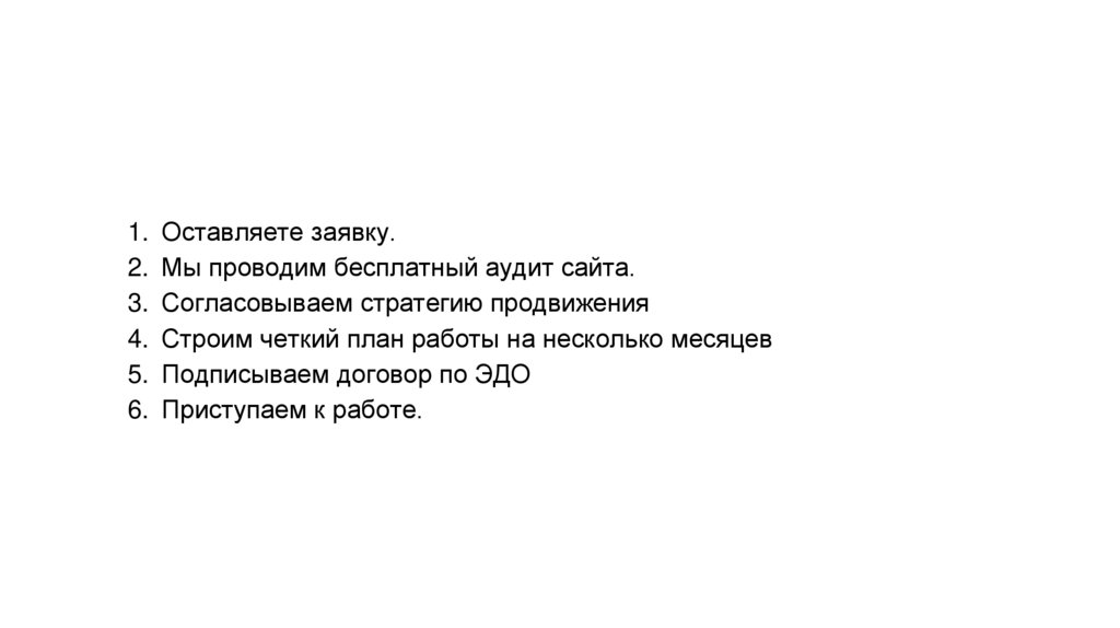 1. Оставляете заявку.2. Мы проводим бесплатный аудит сайта.