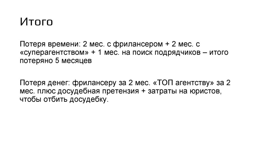 ИтогоПотеря времени: 2 мес. с фрилансером + 2 мес. с
