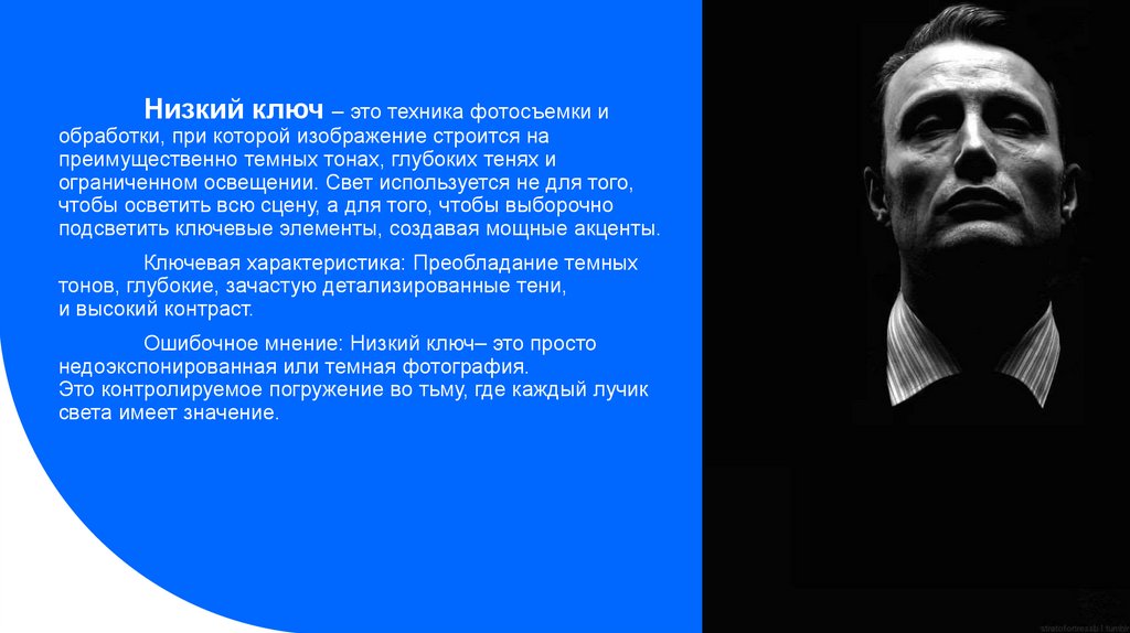 Низкий ключ – это техника фотосъемки иобработки, при которой изображение строится на