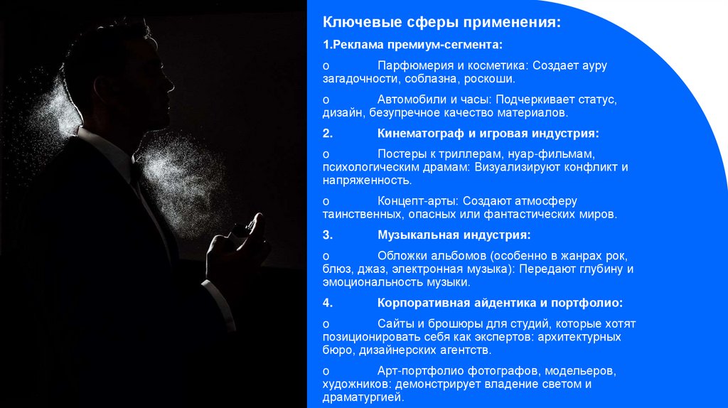 Ключевые сферы применения:1.Реклама премиум-сегмента: