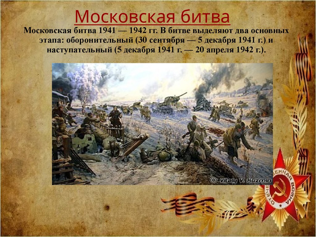 Московская битваМосковская битва 1941 — 1942 гг. В битве выделяют два основных