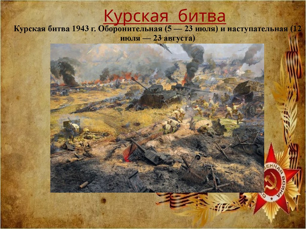 Курская битваКурская битва 1943 г. Оборонительная (5 — 23 июля) и наступательная (12