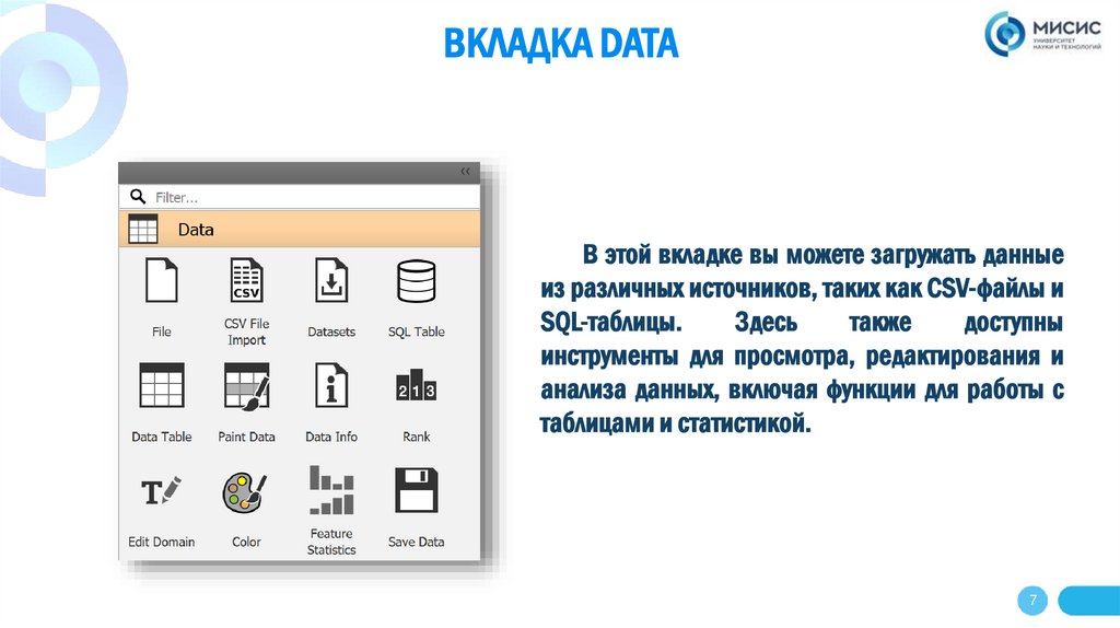 ВКЛАДКА DATAВ этой вкладке вы можете загружать данные