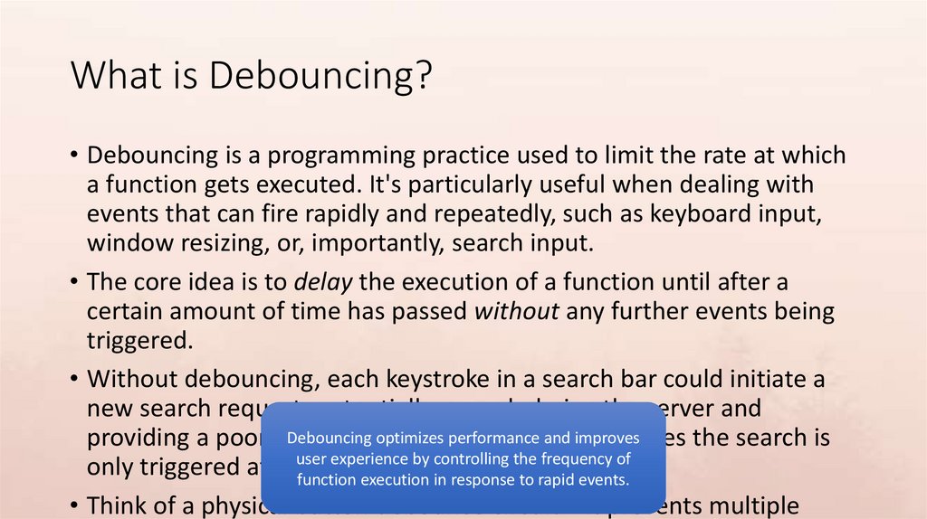 • Without debouncing, each keystroke in a search bar could initiate a