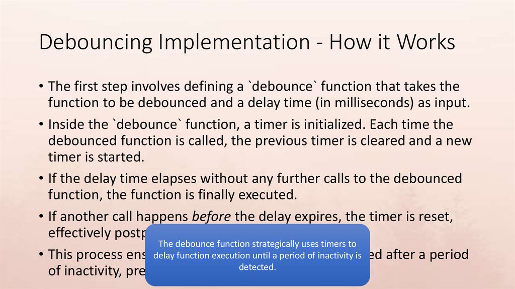 Debouncing Implementation - How it Works• The first step involves defining a `debounce` function that takes the