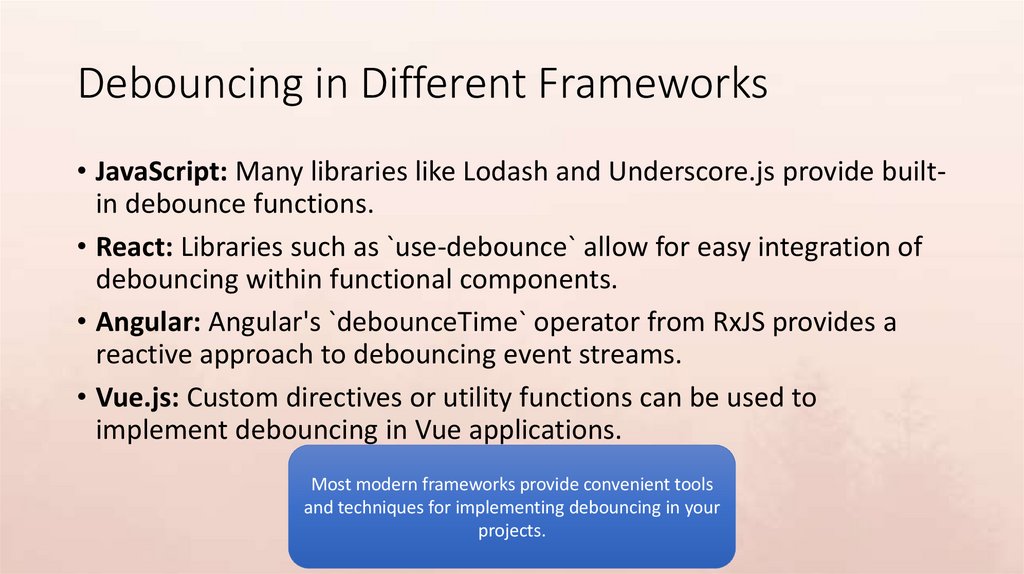 Debouncing in Different Frameworks• JavaScript: Many libraries like Lodash and Underscore.js provide builtin debounce functions.